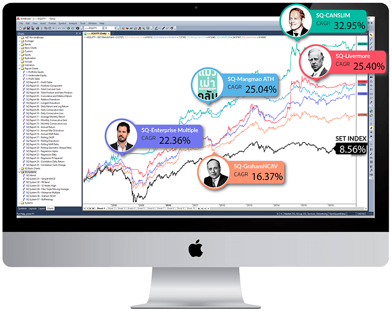 [/vc_toggle][/vc_column][/vc_row][vc_row full_width=”stretch_row”][vc_column][vc_zigzag][vc_empty_space][vc_custom_heading text=”2. วิเคราะห์หุ้นด้วย Indicators ขั้นสูงต่างๆ และลงทุนอย่างเป็นระบบแบบเต็มประสิทธิภาพด้วยโปรแกรม Amibroker” font_container=”tag:h3|font_size:24|text_align:left” use_theme_fonts=”yes”][vc_empty_space][/vc_column][/vc_row][vc_row full_width=”stretch_row”][vc_column width=”1/2″][vc_images_carousel images=”25879,25875,25878,25877,25876,25880,25881″ img_size=”full”][/vc_column][vc_column width=”1/2″][vc_column_text single_style=””]เริ่มต้นการลงทุนการลงทุนอย่างเป็นระบบอย่างง่ายดายและมีประสิทธิภาพด้วยโปรแกรม Amibroker ซึ่งมีขีดความสามารถในระดับสูงและมี User Interface ที่ใช้งานง่าย โดยที่คุณจะสามารถดูกราฟหุ้น, ดูตัวเลขงบการเงิน, สร้างสูตร Scan หุ้นพร้อมกำหนดขนาดการลงทุนที่เหมาะสมจากสัญญาณซื้อขายที่เกิดขึ้นในทุกๆวันได้โดยอัตโนมัติ (Position Sizing) อีกทั้งยังสามารถทำการ Backtest กลยุทธ์การลงทุนต่างๆได้อย่างรวดเร็ว โดยที่ไม่ต้องคอยปวดหัวในการใช้โปรแกรมที่มีศักยภาพที่จำกัด หรือต้องเขียนโปรแกรมในระดับสูง เช่น ภาษา Python, R หรือ C++ ซึ่งไม่ได้ถูกออกแบบมาเพื่อการลงทุนอย่างเป็นระบบโดยเฉพาะ[/vc_column_text][vc_toggle title=”อ่านรายละเอียด Features ของ Amibroker เพิ่มเติม” color=”turquoise” size=”lg”]อ่านรายละเอียด Features ของโปรแกรม Amibroker (ภาษาอังกฤษ)
