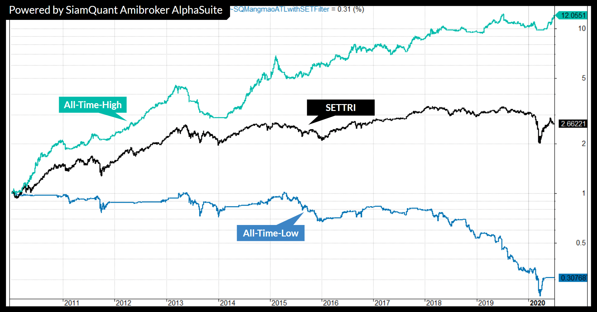 โดยผลจากจากการทดสอบระบบการลงทุนทั้งสองแบบรวมปันผล (Dividend Adjusted Backtest Performance) จาก ฐานข้อมูลหุ้น Amibroker AlphaSuite ในช่วงเวลา 10 กว่าปีหรือตั้งแต่ปี ค.ศ. 2010-01-01 ถึง 2020-06-30 ที่ผ่านมานั้น พบว่ามันได้ให้ผลตอบแทนที่แตกต่างกันราวฟ้ากับเหว โดยที่ระบบ All-Time-High ได้ให้ผลตอบแทนทบต้นที่ราว +26.78% ต่อปี เมื่อเปรียบเทียบกับดัชนี ^SETTRI (SET รวมปันผล) ที่ราว +5.9% ต่อปี และระบบ All-Time-Low ที่ราว -10.6% ต่อปีดังภาพต่อไปนี้