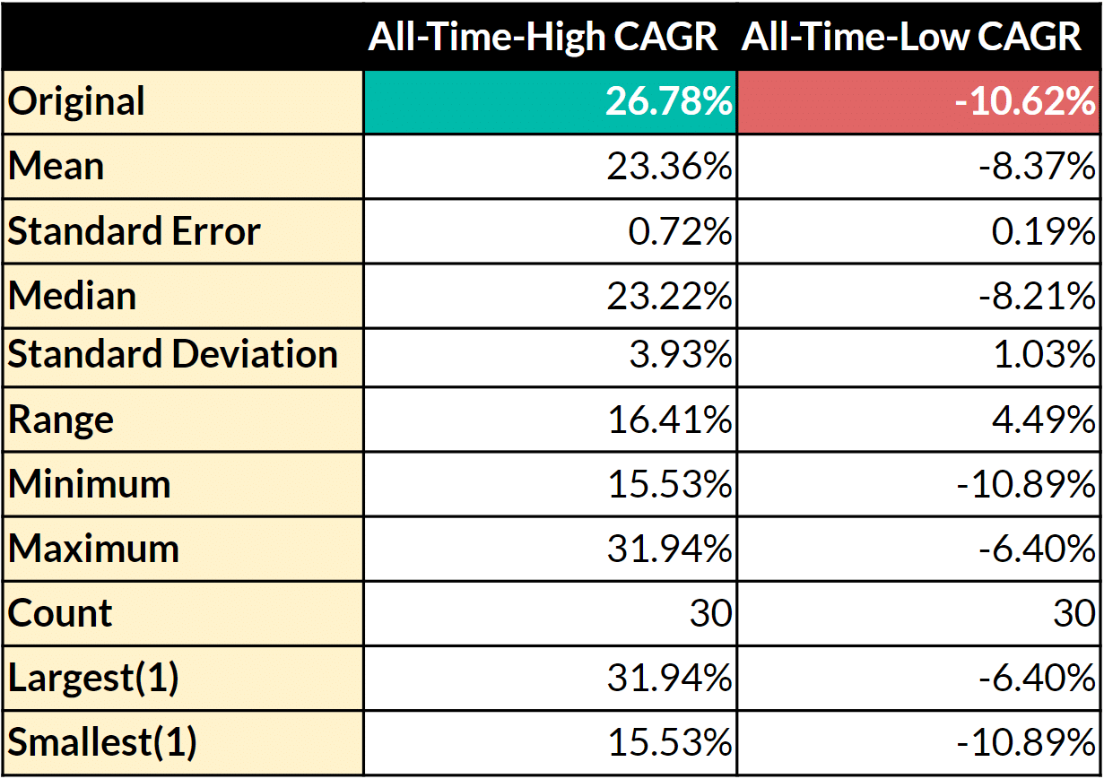 ภาพที่ 3 : ตารางแสดงสถิติผลตอบแทนทบต้นจากการทดสอบการ Execution สัญญาณแบบสุ่มด้วยความน่าจะเป็นที่ 50% เมื่อเกิดสัญญาณขึ้นในแต่ละครั้ง กับกลยุทธ์ All-Time-High และ All-Time-Low ภายใต้การทดลอง 30 ครั้งในแต่ละกลยุทธ์การลงทุน