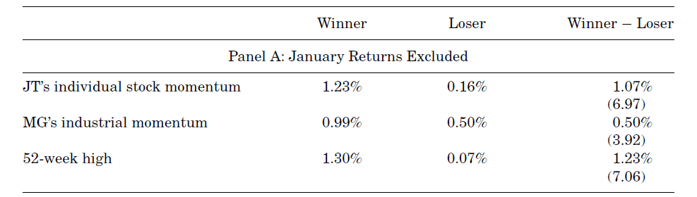 ดังนั้นโดยสรุปแล้วกลยุทธ์การลงทุนแบบ 52-Week High สามารถเอาชนะกลยุทธ์โมเมนตัมแบบดั้งเดิม ที่ใช้เพียงผลตอบแทนของหุ้นในอดีต (JT’s Momentum) และกลยุทธ์โมเมนตัมในกลุ่มอุตสาหกรรม (MG’s Momentum) ได้อย่างมีนัยยะสำคัญ