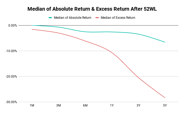 Home»งานวิจัยและบทความทั้งหมด»52 Weeks Low จุดเริ่มต้นของการติดดอยแบบข้ามชาติ!»Median of Absolute Return & Excess Return After 52WL