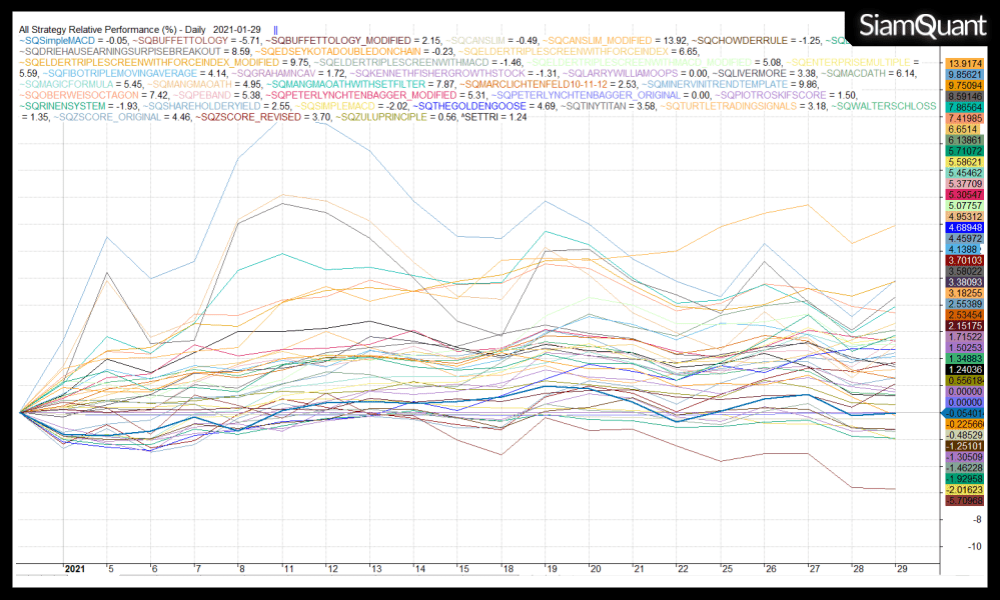 โดยหลังจากที่เราได้กำหนดเงื่อนไขการทดสอบต่างๆไว้เรียบร้อยแล้วนั้น ผมและทางทีมงาน SiamQuant ก็ได้ค่อยๆไล่ Backtest กลยุทธ์การลงทุนต่างๆใน AlphaSuite กันออกมา จากนั้นจึงนำผลลัพธ์ที่ได้มาทำการคิดผลตอบแทนเฉพาะช่วงเดือนมกราคม 2021 ที่ผ่านมาดังนี้ (ใครมึนกับข้อมูลให้ข้ามไปอ่านช่วงสรุปประเด็นได้เลยนะครับ :D)