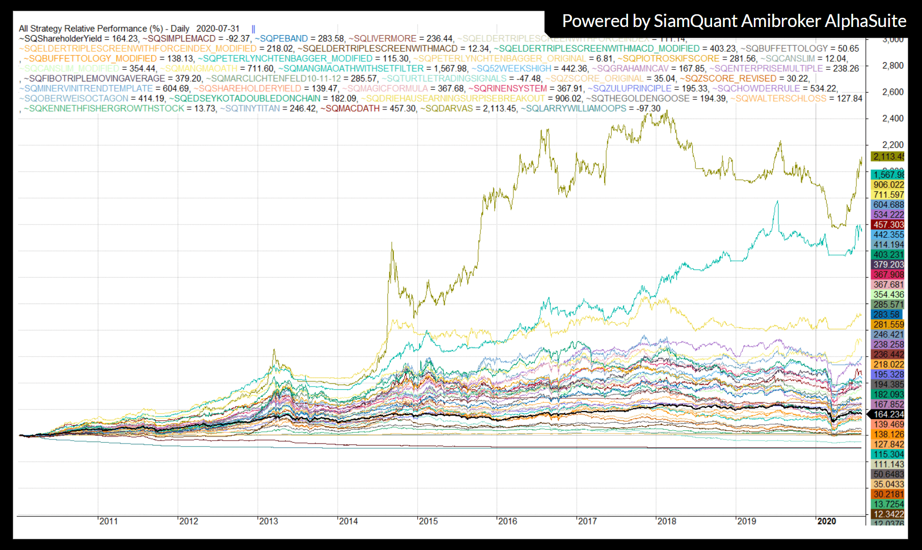 ภาพที่ 1 : ภาพแสดงเส้น Equity ของกลยุทธ์ทั้งหมดใน SiamQuant AlphaSuite เปรียบเทียบกับดัชนี SETTRI Index (เส้นสีดำ) ในช่วง 10 ปีที่ผ่านมา ตั้งแต่ปี 2010 ถึง 2020-07-31