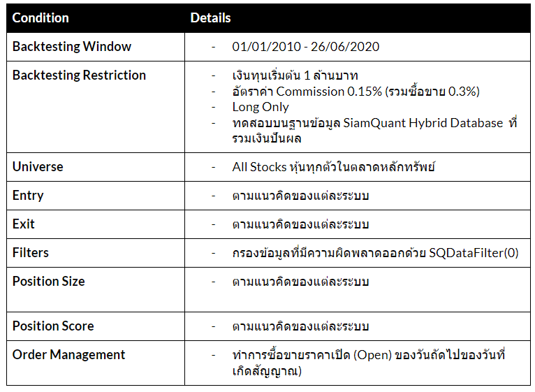สำหรับการทดสอบกลยุทธ์การลงทุนต่างๆเพื่อวัดผลตอบแทนในบทความนี้นั้น เพื่อให้ผลลัพธ์นั้นได้สะท้อนถึงข้อจำกัดและสภาพแวดล้อมต่างๆของนักลงทุนส่วนบุคคลหรือรายย่อยในตลาดหุ้นไทยจนเกิดความสมจริงในระดับหนึ่งนั้น โดยผมได้ทำการทดสอบกลยุทธ์กำหนดเงื่อนไขต่างๆในระดับที่ไม่ได้เข้มงวดมากนัก ดังนี้ (Mild Backtesting Restriction & Environment)