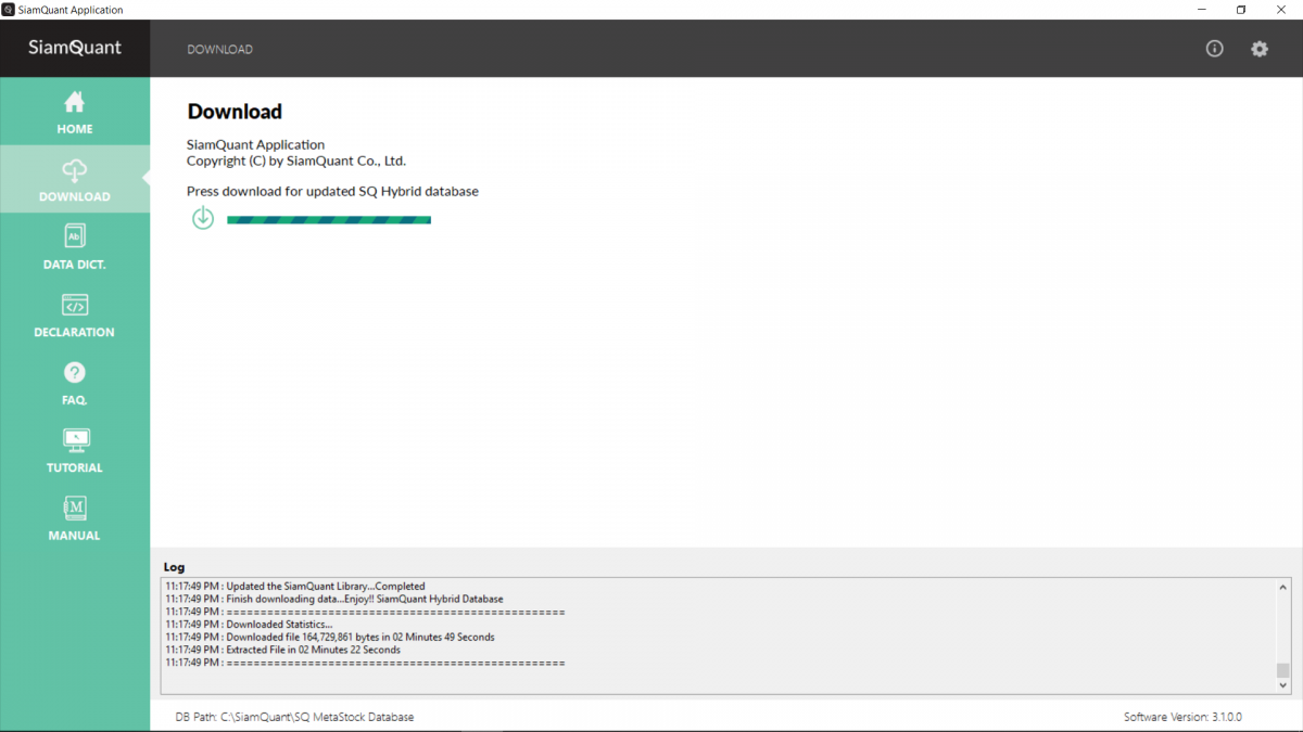 ✔️ โปรแกรม SiamQuant Application ซึ่งจะช่วยอำนวยความสะดวกในการวิจัยออกแบบระบบการลงทุน รวมไปถึงการ Download ฐานข้อมูลในแต่ละวันโดยอัตโนมัติ