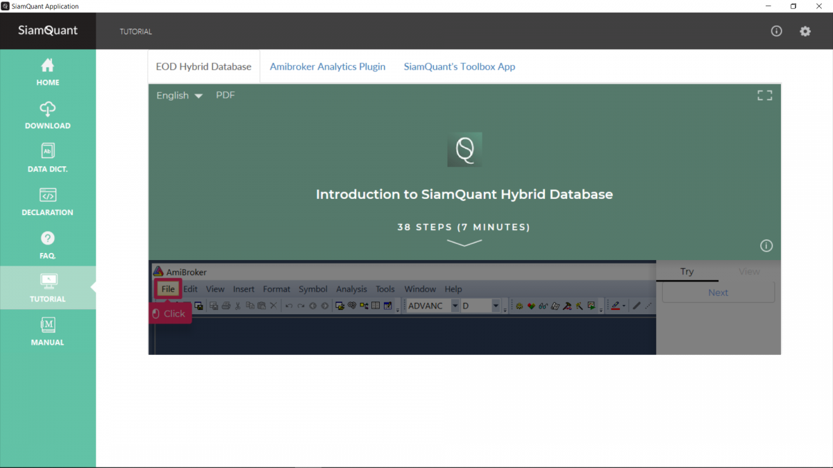 - คู่มือ SiamQuant AlphaSuite ซึ่งมีรายละเอียดสำหรับการใช้งานโดยละเอียดกว่า 200+ หน้า พร้อม Interactive Tutorial สำหรับการใช้งาน