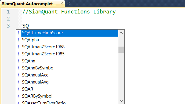 SiamQuant Indicator Function Library : เรียกใช้สูตรในการคำนวณจากกลยุทธ์การลงทุนชื่อดังต่างๆ ด้วยฟังค์ชั่นเพื่อเรียกใช้งานสูตรและอินดิเคเตอร์ทั้งทางเทคนิคและพื้นฐานเพิ่มเติม จำนวนกว่า 50+ ชนิด อาทิเช่น F-Score, Altman Z-Score, Enterprise Value และอื่นๆ เพื่อการวิจัยออกแบบระบบการลงทุนตามแนวคิดของสุดยอดนักลงทุนระดับโลกอย่างรวดเร็ว