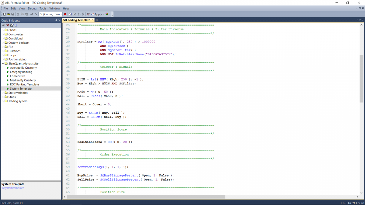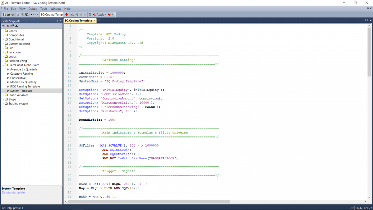 SiamQuant AlphaSuite คือชุดเครื่องมือวิจัยและฐานข้อมูลราคาหุ้นพร้อมงบการเงินคุณภาพสูงสำหรับโปรแกรม Amibroker ที่ถูกพัฒนาขึ้นเพื่อช่วยทำให้การทดสอบวิจัยกลยุทธ์การลงทุนต่างๆเป็นเรื่องที่มีประสิทธิภาพ, ง่ายดาย และสะดวกรวดเร็วมากยิ่งขึ้น เพื่อจะทำให้คุณไม่ต้องเสียเงินทุนและเวลานานหลายปีกว่าจะได้ค้นพบความจริงเหล่านี้ นอกจากนั้นแล้ว มันยังช่วยให้คุณสามารถวิเคราะห์ถึงพฤติกรรมของระบบการลงทุนในเชิงลึก เพื่อให้คุณได้เกิดความเข้าใจในธรรมชาติของผลตอบแทนและความเสี่ยงที่คุณจะได้รับ ก่อนที่คุณจะตัดสินใจนำมันไปใช้เพื่อทำการ Scan ค้นหาสัญญาณการซื้อขายหุ้นที่มีประสิทธิภาพกันได้อย่างรวดเร็ว!
