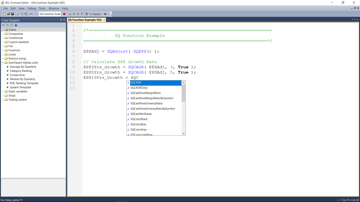(New) Warrant Stock Data : ฐานข้อมูล Warrants รายวัน สำหรับสร้างระบบการลงทุนแบบ Alternative Investing Strategy ในใบสำคัญแสดงสิทธิซื้อหุ้นทุน (Warrant)[/vc_toggle][/vc_column][/vc_row][vc_row full_width=”stretch_row”][vc_column][vc_zigzag][vc_empty_space][vc_custom_heading text=”5. เขียนโค้ดและเรียกใช้งานข้อมูล Fundamental และ Special Indicator ต่างๆได้อย่างรวดเร็วด้วย SiamQuant Amibroker Functions Library อีกกว่า 50+ ฟังค์ชั่น” font_container=”tag:h3|font_size:24|text_align:left” use_theme_fonts=”yes”][vc_empty_space][/vc_column][/vc_row][vc_row][vc_column width=”1/2″][vc_images_carousel images=”21509,21633,21634,21635,21636,21637″ img_size=”full”][/vc_column][vc_column width=”1/2″][vc_column_text single_style=”1″]ลดความปวดหัวและระยะเวลาในการต้องเขียนโค้ดจนยุ่งเหยิงและยาวเหยียด! ด้วยชุด Functions พิเศษสำหรับโปรแกรม Amibroker ซึ่งจะทำให้คุณสามารถเรียกใช้งานข้อมูลต่างๆจำนวนมากได้อย่างรวดเร็วและง่ายดาย โดยสามารถเรียกใช้งานในหน้า Amibroker Code Editor แบบพิมพ์แล้วเด้ง (Auto-Completion) รวมไปถึงการเรียกใช้งานชุดโค้ดระดับสูงต่างๆได้จาก SiamQuant Custom Code Snippets ได้ในทันที[/vc_column_text][vc_toggle title=”อ่านจุดเด่นของชุดฟังค์ชั่นพิเศษ AFL Functions Library เพิ่มเติม” color=”turquoise” size=”lg”]SiamQuant Data Function Library : เรียกใช้ฐานข้อมูลเชิงพื้นฐานต่างๆ ด้วยฟังค์ชั่นเพื่อช่วยคำนวณข้อมูลพื้นฐานงบการเงินเพิ่มเติมจำนวนกว่า 200+ ชนิด อาทิเช่น ข้อมูลกำไรแบบ YoY, QoQ, Rolling และอื่นๆ เพื่อการวิจัยออกแบบระบบการลงทุนเชิงพื้นฐานอย่างรวดเร็ว