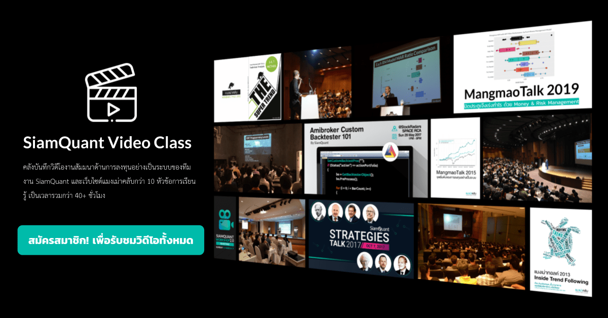 [/vc_column_text][vc_empty_space][/vc_column][vc_column width=”1/6″][/vc_column][/vc_row][vc_row full_width=”stretch_row” disable_element=”yes” css=”.vc_custom_1577528764401{background-color: #f7f7f7 !important;}”][vc_column][vc_empty_space][vc_custom_heading text=”โบนัสพิเศษ สำหรับสมาชิก AlphaSuite ทุกท่าน!” font_container=”tag:h2|font_size:30|text_align:center” use_theme_fonts=”yes”][vc_empty_space][/vc_column][/vc_row][vc_row full_width=”stretch_row” disable_element=”yes” css=”.vc_custom_1577528706979{background-color: #f7f7f7 !important;}”][vc_column width=”1/6″][/vc_column][vc_column width=”2/3″][vc_single_image image=”22973″ img_size=”full” alignment=”center”][vc_custom_heading text=”Bonus #1 : Special Class อบรมการใช้โปรแกรม Amibroker และ AlphaSuite 2 วันเต็ม!” font_container=”tag:h3|font_size:24|text_align:left” use_theme_fonts=”yes”][vc_empty_space][vc_separator color=”custom” align=”align_left” border_width=”6″ el_width=”20″ accent_color=”#00bbaa”][vc_column_text single_style=”1″]งานสัมมนา Workshop AlphaSuite Bootcamp ในเดือนมกราคม ปีค.ศ. 2020 สำหรับสมาชิกประเภท SiamQuant AlphaSuite Membership โดยมีเนื้อหาเกี่ยวกับการใช้งานโปรแกรม Amibroker และ AlphaSuite ในการวิจัยออกแบบระบบการลงทุน และการอธิบายชุดโค้ดระบบการลงทุน SiamQuant Strategies Pack ทีน่าสนใจ เพื่อให้สามารถนำแนวคิดบางอย่างไปประยุกต์ใช้ในการสร้างระบบการลงทุนของคุณได้อย่างรวดเร็ว[/vc_column_text][/vc_column][vc_column width=”1/6″][/vc_column][/vc_row][vc_row full_width=”stretch_row” disable_element=”yes” css=”.vc_custom_1584430126441{background-color: #f7f7f7 !important;}”][vc_column width=”1/6″][/vc_column][vc_column width=”2/3″][vc_single_image image=”22953″ img_size=”full” alignment=”center” onclick=”custom_link” img_link_target=”_blank” link=”https://www.siamquant.com/video-class/”][vc_custom_heading text=”สิทธิในการเข้ารับชมบันทึกงานสัมมนาด้านการลงทุนอย่างเป็นระบบเชิงลึก SiamQuant Video Class” font_container=”tag:h3|font_size:24|text_align:left” use_theme_fonts=”yes”][vc_empty_space][vc_separator color=”custom” align=”align_left” border_width=”6″ el_width=”20″ accent_color=”#00bbaa”][vc_column_text single_style=”1″]เติมเต็มแนวคิดในการลงทุน ด้วยองค์ความรู้จากบันทึกงานสัมมนาด้านการลงทุนอย่างเป็นระบบในเชิงลึกโดยทีมงาน SiamQuant พร้อมผลการวิจัยทดสอบทางสถิติย้อนหลังในตลาดหุ้นไทย รวมความยาวกว่า 40+ ช.ม. ซึ่งจะช่วยให้คุณสามารถยกระดับการวิจัยออกแบบระบบการลงทุนของคุณได้อย่างชัดเจน อ่านรายละเอียดเพิ่มเติมได้ที่ >>> SiamQuant Video Class[/vc_column_text][vc_empty_space][vc_btn title=”พิเศษ! โปรโมชั่น Christmas Gift ลดราคา 5,000 บาท (สามารถผ่อนชำระ 0% สิบเดือนได้)” style=”flat” color=”danger” size=”lg” align=”center” link=”url:https%3A%2F%2Fwww.siamquant.com%2Falphasuite%2F%23AlphaSuitePricing|||”][vc_empty_space][/vc_column][vc_column width=”1/6″][/vc_column][/vc_row][vc_row full_width=”stretch_row” disable_element=”yes” css=”.vc_custom_1563302717249{background-color: #f7f7f7 !important;}”][vc_column width=”1/6″][/vc_column][vc_column width=”2/3″][vc_single_image image=”21713″ img_size=”full” alignment=”center”][vc_custom_heading text=”Bonus #1 : Workshop อบรมการใช้งาน AlphaSuite 2 วันเต็ม!” font_container=”tag:h3|font_size:24|text_align:left” use_theme_fonts=”yes”][vc_empty_space][vc_separator color=”custom” align=”align_left” border_width=”6″ el_width=”20″ accent_color=”#00bbaa”][vc_column_text single_style=”1″]งานสัมมนา Workshop AlphaSuite Bootcamp ในเดือนพฤษภาคม 2019 สำหรับสมาชิกประเภท Standard และ Professional Member โดยมีเนื้อหาเกี่ยวกับการใช้งาน AlphaSuite ในการวิจัยออกแบบระบบการลงทุน และการอธิบายชุดโค้ดระบบการลงทุน SiamQuant Strategies Pack ทีน่าสนใจ เพื่อให้สามารถนำแนวคิดบางอย่างไปประยุกต์ใช้ในการสร้างระบบการลงทุนของคุณได้อย่างรวดเร็ว