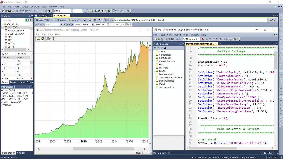 [/vc_toggle][/vc_column][/vc_row][vc_row full_width=”stretch_row”][vc_column][vc_zigzag][vc_empty_space][vc_custom_heading text=”2. วิเคราะห์หุ้นด้วย Indicators ขั้นสูงต่างๆ และลงทุนอย่างเป็นระบบแบบเต็มประสิทธิภาพด้วยโปรแกรม Amibroker” font_container=”tag:h3|font_size:24|text_align:left” use_theme_fonts=”yes”][vc_empty_space][/vc_column][/vc_row][vc_row full_width=”stretch_row”][vc_column width=”1/2″][vc_images_carousel images=”25879,25875,25878,25877,25876,25880,25881″ img_size=”full”][/vc_column][vc_column width=”1/2″][vc_column_text single_style=””]เริ่มต้นการลงทุนการลงทุนอย่างเป็นระบบอย่างง่ายดายและมีประสิทธิภาพด้วยโปรแกรม Amibroker ซึ่งมีขีดความสามารถในระดับสูงและมี User Interface ที่ใช้งานง่าย โดยที่คุณจะสามารถดูกราฟหุ้น, ดูตัวเลขงบการเงิน, สร้างสูตร Scan หุ้นพร้อมกำหนดขนาดการลงทุนที่เหมาะสมจากสัญญาณซื้อขายที่เกิดขึ้นในทุกๆวันได้โดยอัตโนมัติ (Position Sizing) อีกทั้งยังสามารถทำการ Backtest กลยุทธ์การลงทุนต่างๆได้อย่างรวดเร็ว โดยที่ไม่ต้องคอยปวดหัวในการใช้โปรแกรมที่มีศักยภาพที่จำกัด หรือต้องเขียนโปรแกรมในระดับสูง เช่น ภาษา Python, R หรือ C++ ซึ่งไม่ได้ถูกออกแบบมาเพื่อการลงทุนอย่างเป็นระบบโดยเฉพาะ[/vc_column_text][vc_toggle title=”อ่านรายละเอียด Features ของ Amibroker เพิ่มเติม” color=”turquoise” size=”lg”]อ่านรายละเอียด Features ของโปรแกรม Amibroker (ภาษาอังกฤษ)