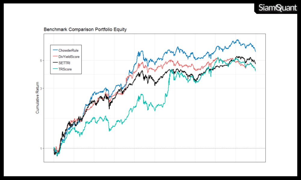 โดยในการทดสอบนี้เราจะทำการแบ่งระบบการลงทุนออกเป็น 3 ระบบ โดยระบบแรก ‘Chowder Rule’ ซึ่งก็คือ การทดสอบกฎการคัดกรอง Chowder Rule โดยใช้การคำนวนอัตราการเติบโตของเงินปันผลด้วย CAGR 3 ปี และระบบที่สอง TR Score คือการทดสอบที่ทุกอย่างเหมือนเดิมแต่ตัดกฎการคัดกรอง Chowder Rule ออก เพื่อศึกษาประสิทธิภาพและผลกระทบของการคัดกรอง และระบบ DivYield Score ที่จะลงทุนในหุ้นที่มีค่า Dividend Yield สูงสุด