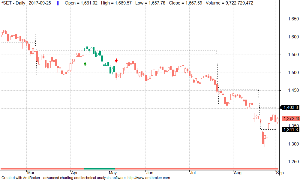 เมื่อคุณลองสังเกตตัวอย่าง Darvas Box หรือเจ้ากล่องเงินล้านนี้จากภาพต่อไปนี้ แท้จริงแล้วคุณจะพบว่ามันก็คือกรอบแนวรับแนวต้านของราคาหุ้นนั่นเองครับ (แต่มีเงื่อนไขที่ชัดเจนตามที่ Darvas ได้ระบุไว้ในหนังสือ) โดยทางเราจึงเขียนโค้ดโปรแกรม Amibroker สำหรับการจำลองสร้าง Darvas Box ซึ่งทดลองกับดัชนี SET Index เพื่อเป็นกรณีศึกษาการทำงานของเจ้ากล่องเงินล้านนี้ครับ