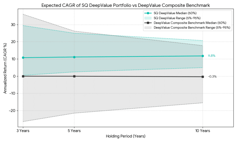 ข้อมูลต่อไปนี้คือผลการวิจัยทดสอบย้อนหลังด้วยความสมจริงและความเข้มงวดในระดับสูง ของกลยุทธ์การลงทุนแบบ DeepValue Strategy ซึ่งได้รวมเอาผลกระทบจากค่าธรรมเนียมในการบริหารจัดการต่างๆ รวมถึงผลกระทบจากสภาพคล่องและขนาดพอร์ตการลงทุน เปรียบเทียบกับดัชนีชี้วัด DeepValue Composite Benchmark ซึ่งสร้างขึ้นจากสัดส่วนการลงทุนโดยเฉลี่ยในระยะยาวของกลยุทธ์ ตั้งแต่ปี ค.ศ. 2017-2025 โดยมีสัดส่วนของดัชนีชี้วัด และผลลัพธ์การวิจัยทดสอบดังต่อไปนี้
