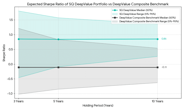ภาพและตารางสถิติความน่าจะเป็นของค่าผลตอบแทนต่อความเสี่ยงของพอร์ตการลงทุนวัดด้วย Sharpe Ratio ของกลยุทธ์ DeepValue เปรียบเทียบกับดัชนีชี้วัดผลการลงทุน DeepValue Composite Benchmark (SET100:10% + sSET:75% + MAI:15%) ในระยะเวลาการลงทุน 3, 5 และ 10 ปี ด้วยเทคนิค Monte Carlo Bootstrapping Simulation