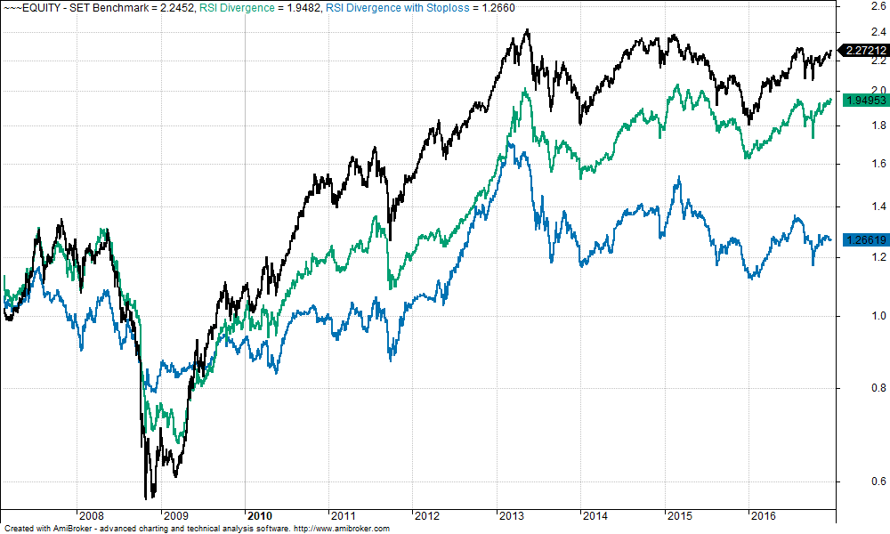 จากผลลัพธ์ของการทดสอบย้อนหลังระบบลงทุนด้วยกลยุทธ์ RSI Divergence ตั้งแต่วันที่ 31/12/20016 – 31/12/2016 นั้นจะเห็นได้ว่ากลยุทธ์นี้ไม่สามารถชนะผลตอบแทนของตลาดได้ทั้งในกรณีที่มีการใส่ Stoploss หรือไม่ก็ตาม โดยค่าสถิติที่น่าสนใจจากผลทดสอบคือ