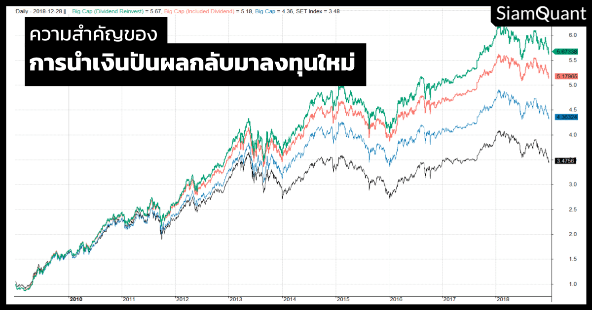 อย่างไรก็ตาม ถึงแม้ว่าการคิดผลตอบแทนโดยนำเงินปันผลมารวมด้วยนั้นจะทำให้ผลตอบแทนในภาพรวมเพิ่มสูงขึ้น แต่ยังขาดปัจจัยหนึ่งที่สำคัญนั้นคือ การที่นักลงทุนนำเงินปันผลที่ได้รับในแต่ละปีกลับมาลงทุนใหม่ (Dividend Reinvest) นั่นเอง