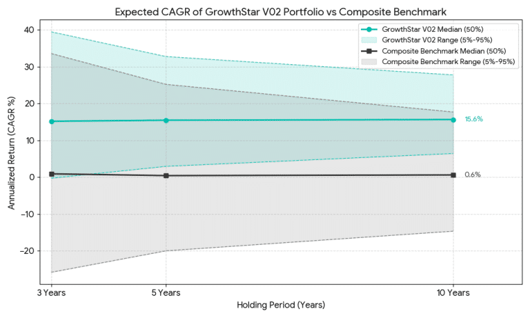 ข้อมูลต่อไปนี้คือผลการวิจัยทดสอบย้อนหลังด้วยความสมจริงและความเข้มงวดในระดับสูง ของกลยุทธ์การลงทุนแบบ GrowthStars Strategy ซึ่งได้รวมเอาผลกระทบจากค่าธรรมเนียมในการบริหารจัดการต่างๆ รวมถึงผลกระทบจากสภาพคล่องและขนาดพอร์ตการลงทุน เปรียบเทียบกับดัชนีชี้วัด GrowthStars Composite Benchmark ซึ่งสร้างขึ้นจากสัดส่วนการลงทุนโดยเฉลี่ยในระยะยาวของกลยุทธ์ ตั้งแต่ปี ค.ศ. 2017-2025 โดยมีสัดส่วนของดัชนีชี้วัด และผลลัพธ์การวิจัยทดสอบดังต่อไปนี้