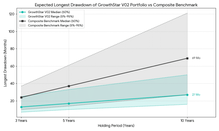 ภาพและตารางสถิติความน่าจะเป็นของระยะเวลาในการถดถอยที่ยาวนานที่สุดของพอร์ตการลงทุนหรือ Longest DD (Recovery Time) ของกลยุทธ์ GrowthStars เปรียบเทียบกับดัชนีชี้วัดผลการลงทุน GrowthStars Composite Benchmark (SET100:30% + sSET:60% + MAI:10%) ในระยะเวลาการลงทุน 3, 5 และ 10 ปี ด้วยเทคนิค Monte Carlo Bootstrapping Simulation