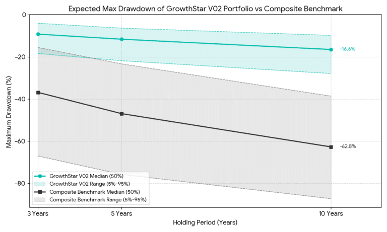 ภาพและตารางสถิติความน่าจะเป็นของอัตราการถดถอยสูงสุดของพอร์ตการลงทุนหรือ Max.DD ของกลยุทธ์ GrowthStars เปรียบเทียบกับดัชนีชี้วัดผลการลงทุน GrowthStars Composite Benchmark (SET100:30% + sSET:60% + MAI:10%) ในระยะเวลาการลงทุน 3, 5 และ 10 ปี ด้วยเทคนิค Monte Carlo Bootstrapping Simulation