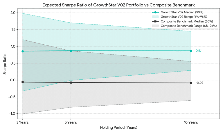 ภาพและตารางสถิติความน่าจะเป็นของค่าผลตอบแทนต่อความเสี่ยงของพอร์ตการลงทุนวัดด้วย Sharpe Ratio ของกลยุทธ์ GrowthStars เปรียบเทียบกับดัชนีชี้วัดผลการลงทุน GrowthStars Composite Benchmark (SET100:30% + sSET:60% + MAI:10%) ในระยะเวลาการลงทุน 3, 5 และ 10 ปี ด้วยเทคนิค Monte Carlo Bootstrapping Simulation