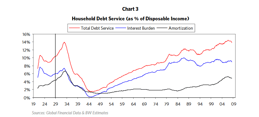 ในภาพที่ 11 Chart 3 แสดงภาระดอกเบี้ย (Interest Burden), การผ่อนชำระเงินต้น (Amortization) และ ภาระหนี้ที่ต้องจ่ายทั้งหมด (Total Debt Service) ในภาคครัวเรือนของสหรัฐย้อนหลังไปถึงปี ค.ศ.1920 โดยเราเลือกที่จะแสดงในส่วนนี้ เพราะว่าภาคครัวเรือน (Household) คือส่วนที่สำคัญที่สุดของเศรษฐกิจ (อย่างไรก็ตามหลักการนี้สามารถนำไปใช้ได้ดีกับทุกภาคส่วน)