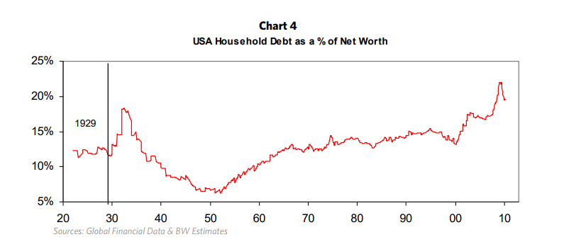 Chart 4 แสดงหนี้ส่วนของภาคครัวเรือน (House Hold Debt) เทียบกับของความมั่งคั่งสุทธิ (Net Worth) ซึ่งทำให้เราเห็นว่าอัตราการกู้ยืม ( Leverage ratio) พุ่งสูงขึ้นจากตอนแรกที่สูงอยู่แล้วช่วงที่เกิด The Great Depression ในปี ค.ศ. 1930 การหดตัวของความมั่งคั่งสุทธิเกิดจากการลดลงของราคาอสังหาริมทรัพย์และราคาหุ้น จากที่เคยกล่าวไปก่อนหน้าแล้วว่าในระบบ Credit-based economy ความสามารถในการใช้จ่ายจะขยายตัวตามความสามารถในการกู้ยืม ซึ่งการที่จะเป็นเช่นนั้นผู้ให้กู้จะต้องมีความ เชื่อว่า