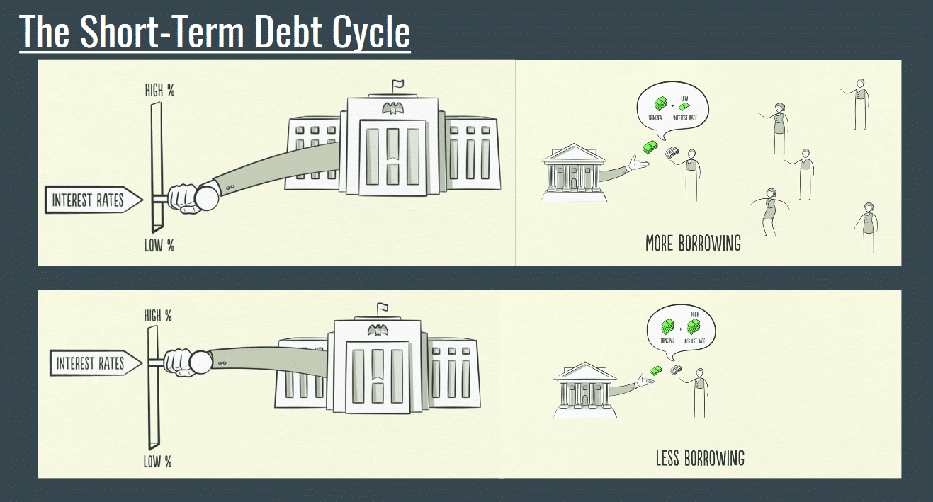 วงจรหนี้ระยะสั้น (Short Term Debt Cycle) หรือเรียกอีกอย่างว่าวงจรธุรกิจ (Business Cycle) โดยพื้นฐานแล้วถูกควบคุมโดยนโยบายดอกเบี้ยของธนาคารกลาง ซึ่งมีดังนี้