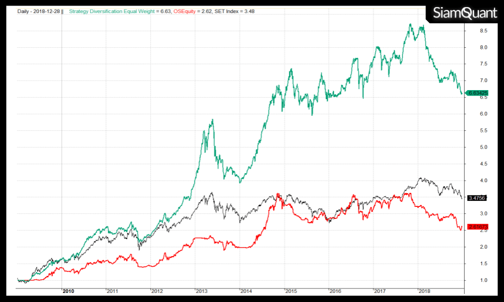 หลังจากที่ทราบกันดีแล้วว่าการสลับเปลี่ยนกลยุทธ์บ่อยๆนั้นไม่ได้เกิดผลดี แต่ในกรณีที่เรามีกลยุทธ์การลงทุนที่มีประสิทธิภาพอยู่หลายกลยุทธ์ด้วยกัน การกระจายความเสี่ยงลงไปในทุกๆกลยุทธ์ (Strategy Diversification) นั้นถือเป็นทางเลือกที่ดีกว่า