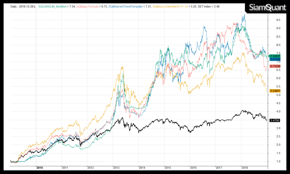 หมายเหตุ : สำหรับกลยุทธ์การลงทุน CANSLIM เราได้ทำการทดสอบจากชุดโค้ดที่มีการปรับแต่งโดยทีมงาน SiamQuant เพื่อให้มีความเหมาะสมกับตลาดหุ้นไทยมากขึ้น ซึ่งอ้างอิงจากเนื้อหาในงานสัมนา SQ Strategy Talk 2017