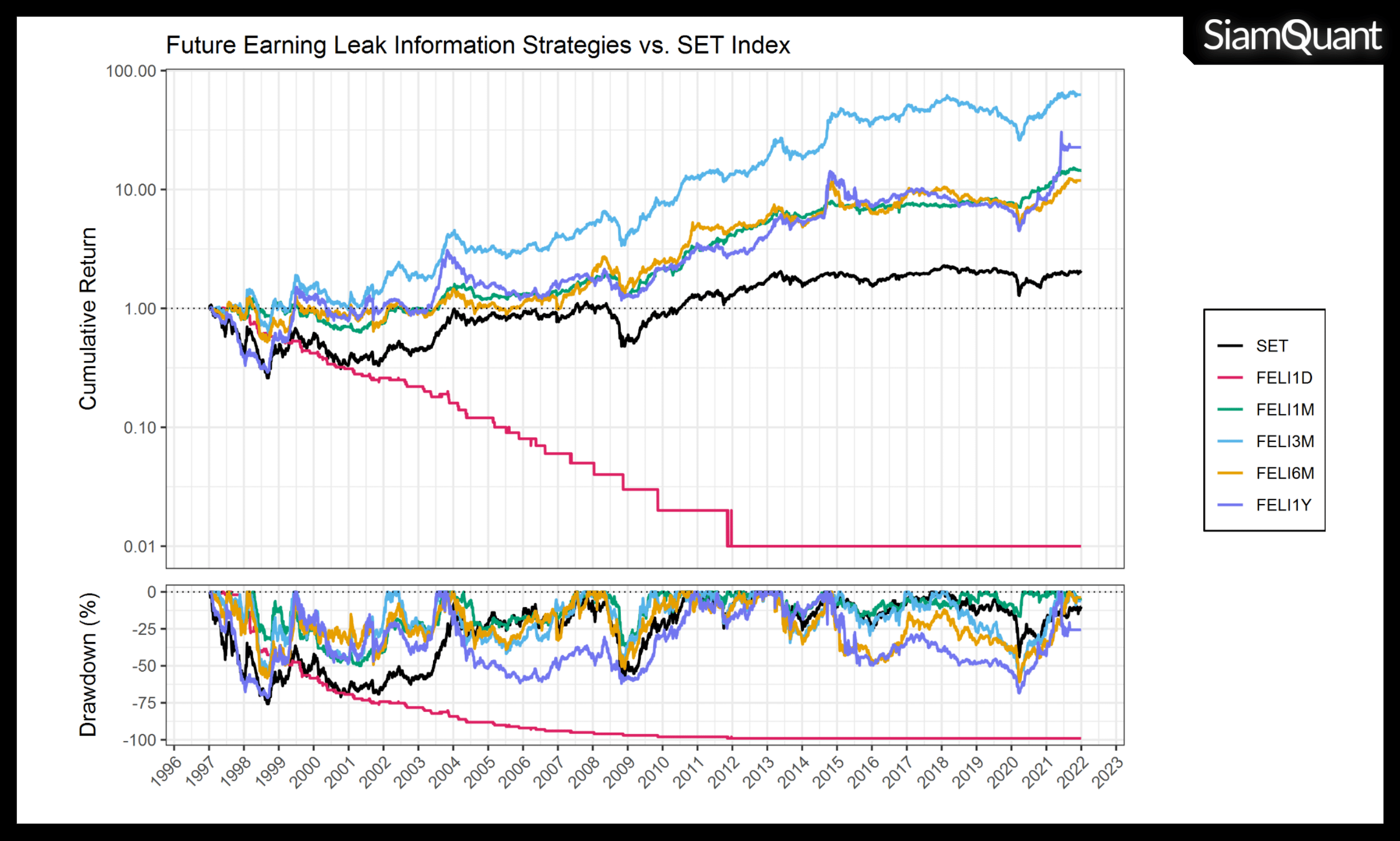 ภาพที่ 4 : ภาพการเติบโตของเงินทุนจากกลยุทธ์ Future Earning Leak Information (FELI Strategy) ตามระยะเวลาการล่วงรู้ข้อมูลล่วงหน้าที่ 1 วัน, 1 เดือน, 3 เดือน, 6 เดือน และ 1 ปี เปรียบเทียบกับดัชนี SET Index ตั้งแต่ปี ค.ศ. 1997-2021 รวมระยะเวลา 25 ปี (แสดงภาพแบบ Log-Scale)
