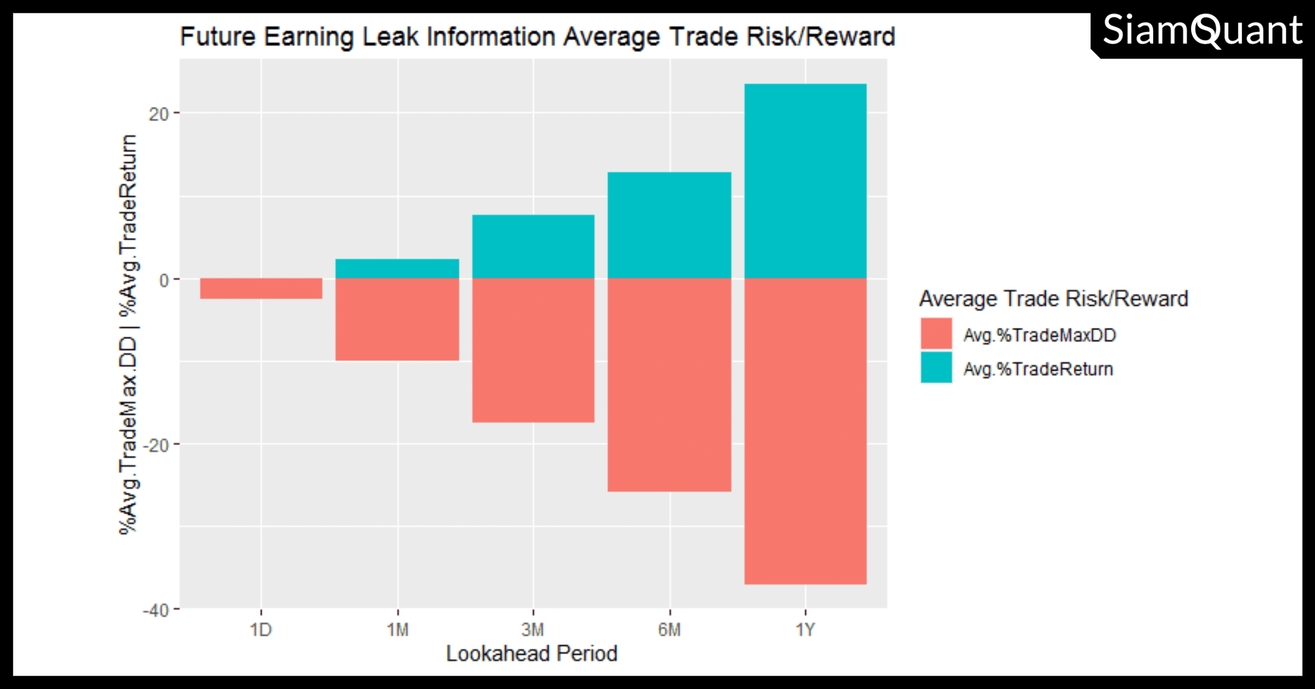 ภาพที่ 3 : ภาพ Bar Chart แสดงค่าเฉลี่ย (Average Mean) ของผลกำไรจากสัญญาณการซื้อขาย (%Average Trade Return) และค่าเฉลี่ยของอัตราการถดถอยของราคาหุ้นสูงสุดระหว่างการถือครอง (%Average Trade Max.Drawdown) ตามระยะเวลาของการล่วงรู้ข้อมูลล่วงหน้า (Lookahead Period) เป็นระยะเวลา 1 วัน, 1 เดือน, 3 เดือน, 6 เดือน และ 1 ปี