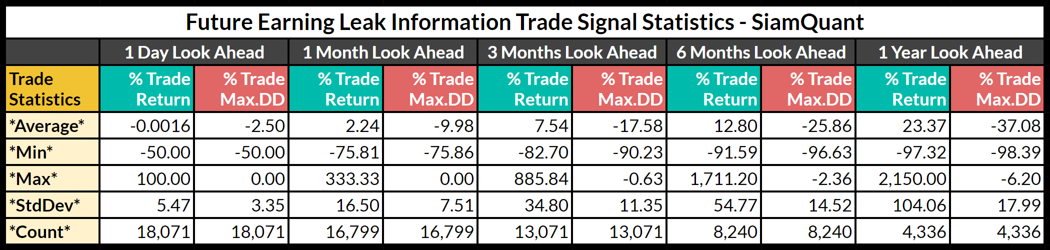 Future Earning Leak Information Trade Statistics Table – SiamQuant