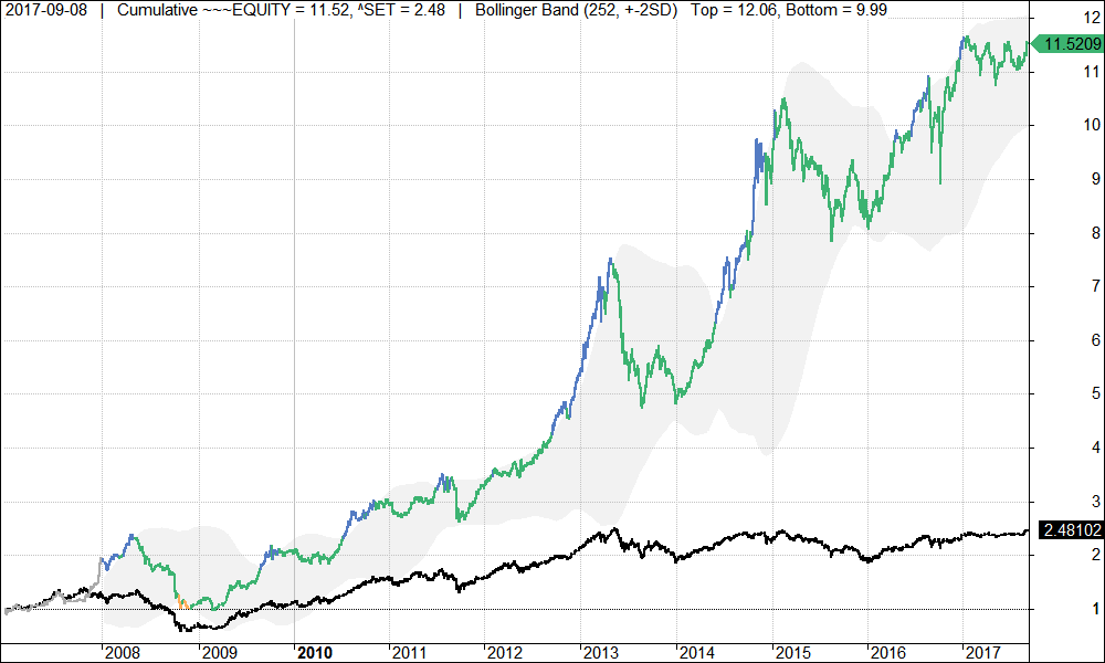 ภาพที่ 4 : ลักษณะการเติบโตของพอร์ทโฟลิโอของกลยุทธ์ SiamQuant Modified NCAV เทียบกับดัชนี SET Index ตั้งแต่ปี ค.ศ. 2007-2017 ซึ่งทำให้พอร์ทโฟลิโอเติบโตกว่า 11.52 เท่า
