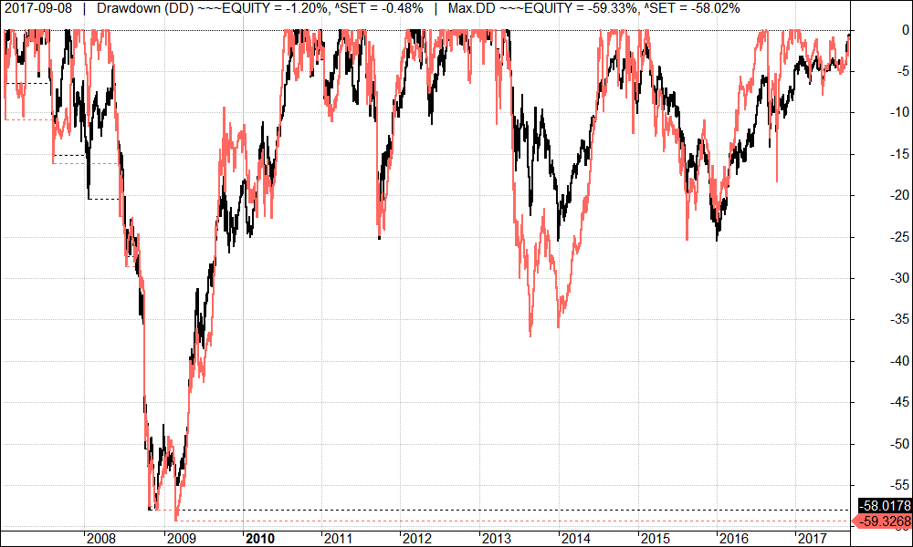 ในอีกมุมนึงนั้น แม้ว่าผลตอบแทนจะเพิ่มขึ้น แต่เมื่อเรามองไปยังความเสี่ยงของพอร์ท เราจะพบว่าค่า Maximum Drawdown ของพอร์ทได้สะท้อนว่ากลยุทธ์การถือหุ้นแบบนี้มีความผันผวนสูงพอๆกับดัชนี SET Index เลยทีเดียว โดยมีค่า Max.DD ที่ราว 59% เมื่อเปรียบเทียบกับ SET Index ที่ 58% ดังนั้นแล้ว เราจะเห็นได้ว่าผลตอบแทนที่สูงขึ้นก็มีต้นทุนที่คุณต้องยอมจ่าย และเข้าใจมันให้ดีเสียก่อนที่จะมาใช้กลยุทธ์นี้ ไม่งั้นสติแตกแน่ๆครับ