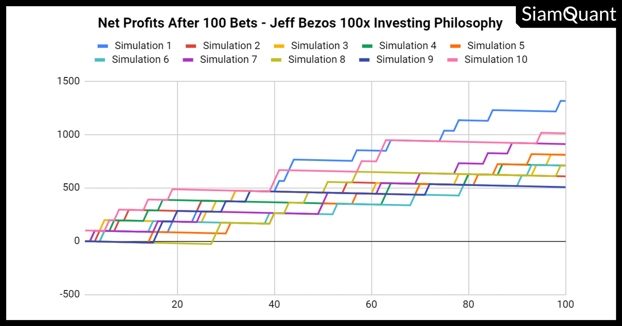 และเพื่อที่จะทำให้คุณได้เห็นผลลัพธ์ของมันอย่างชัดเจนนั้น ผมจึงได้ทำการทดลองสร้างผล Simulation ของผลตอบแทนสะสม ซึ่งเกิดขึ้นจาก “ปรัชญาการลงทุน 100X” ของ Jeff Bezos ซึ่งมีค่า Expectancy ที่ราว 9.1 เท่า เป็นจำนวน 10 รอบ (10 Random Experimental Runs) เพื่อให้มันเป็นตัวแทนของคนจำนวน 10 คน ซึ่งได้ทดลองใช้แนวคิดนี้ในการลงทุนของพวกเขา โดยผลลัพธ์ที่เกิดขึ้นนั้นมีลักษณะดังต่อไปนี้