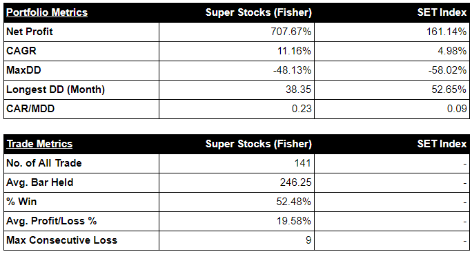จากภาพและตารางข้างต้นจะสังเกตได้ว่า กลยุทธ์การลงทุน Kenneth Fisher นั้นให้ผลตอบแทนที่สูงกว่าดัชนี SET Index ในระยะยาวอย่างมีนัยยะ โดยมีอัตราส่วน CAGR เท่ากับ 11.16% และ 4.98% ตามลำดับหรือมีผลตอบแทนส่วนเกินที่สูงถึง 6.18% ต่อปี