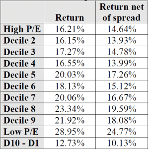 ซึ่งจุดเด่นของงานวิจัยชิ้นนี้ก็คือ มันเป็นผลวิจัยที่เกิดจากฐานข้อมูล ที่ไม่มีความลำเอียงจากหุ้นที่ถูกถอดถอน (De-listed) ออกจากตลาดไปแล้ว หรือที่เรารู้จักกันในเรื่องของ Survivorship Bias นอกจากนี้ พวกเขายังได้คำนวนค่าคลาดเคลื่อนของราคา (Slippage) ขึ้นมาจากข้อมูล Bid-Ask ในแต่ละวันตลอดช่วงระยะเวลาทดสอบอีกด้วย ซึ่งต่างกับบทวิจัยเกี่ยวกับค่า P/E Ratio ในช่วงก่อนหน้า ที่มักจะไม่คำนึงถึงความเป็นจริงเหล่านี้ และนำไปสู่การคำนวนผลตอบแทนที่ออกมาดีเกินจริง ซึ่งจุดนี้เองเป็นสิ่งสำคัญที่งานวิจัยคุณภาพสูงจะไม่มองข้ามไปโดยเด็ดขาดครับ