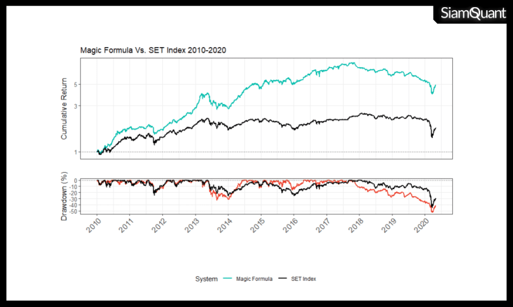 แต่ในด้านความเสี่ยงที่วัดโดยค่า MaxDrawdown นั้นระบบการลงทุน Magic Formula มีค่าอยู่ที่ -52.52% ในช่วงเดือนมีนาคม 2020 ซึ่งสูงกว่า ดัชนี SET index ที่มีค่า MaxDrawdown อยู่ที่ -44.22% อยู่พอสมควร