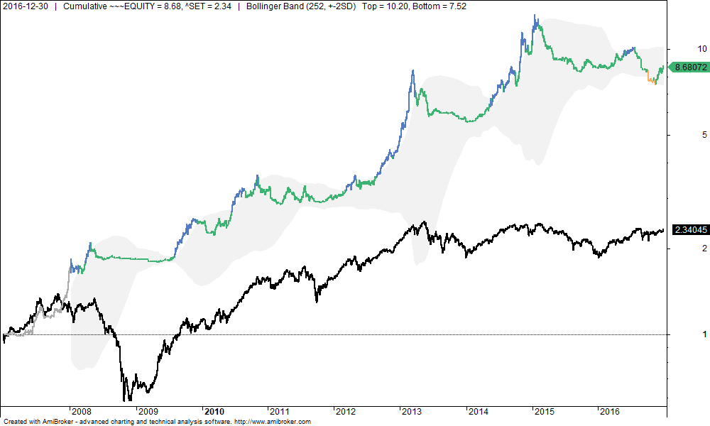 ภาพที่ 6 : มูลค่าพอร์ตโฟลิโอของระบบ Breakout 250 วัน + Minervini Template (เส้นสีเขียว) และดัชนี SET Index (เส้นสีดำ)