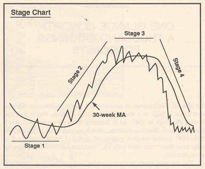 นอกจากแนวคิดในการค้นหาหุ้น Super Performer แล้ว Mark Minervini ยังได้รับอิทธิพลในการวิเคราะห์รูปแบบราคาด้วยปัจจัยเทคนิคที่ Stan WeinStein เขียนไว้ในหนังสือ “Secrets for Profiting in Bull and Bear Markets” ที่ทำการวิเคราะห์รูปแบบราคาหุ้น (Price Pattern) และทำการแบ่งพฤติกรรมของหุ้นออกเป็น “Stage” ทั้ง 4 Stage โดยสามารถดูตัวอย่างได้จากภาพที่ 1