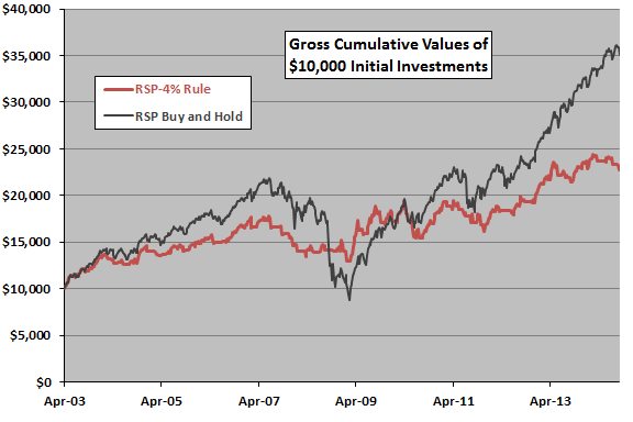 ผลตอบแทนจากการใช้กฎ 4 % กับ SPY, QQQ, IWM, RSP โดยที่ไม่มีค่าธรรมเนียมการซื้อขาย ถูกแสดงไว้ในกราฟต่อไปนี้ตามลำดับ โดยได้แสดงผลตอบแทนจากการใช้กลยุทธ์ buy-and-hold กับ ETFs เหล่านั้นไว้เพื่อเป็นเกณฑ์เปรียบเทียบ