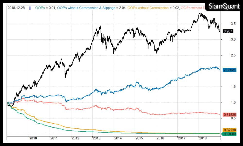 จึงไม่น่าแปลกใจเลยที่ เมื่อทำการทดลองรวมค่าคอมมิสชั่นเข้าไปเพียงอย่างเดียว (0.30% ไปกลับ) ก็สามารถทำให้ระบบการลงทุนนั้นขาดทุนทันที และยิ่งหากมีการเพิ่มค่าสลิปเพจเข้าไปด้วยจะยิ่งทำให้ผลตอบแทนติดลบไปกันใหญ่ ดังนั้นนี่จึงเป็นสาเหตุที่ว่าทำไมเราจึงเน้นย้ำอยู่ตลอดเวลาในเรื่องของการสร้างระบบการลงทุนที่มีค่า Avg. Profit/Loss % หรือค่า Expectancy ที่เป็นบวก เพราะจะช่วยให้กลยุทธ์สามารถทนทานกับต้นทุนต่างๆได้ โดยกลยุทธ์ไม่พังไปเสียก่อนนั่นเอง