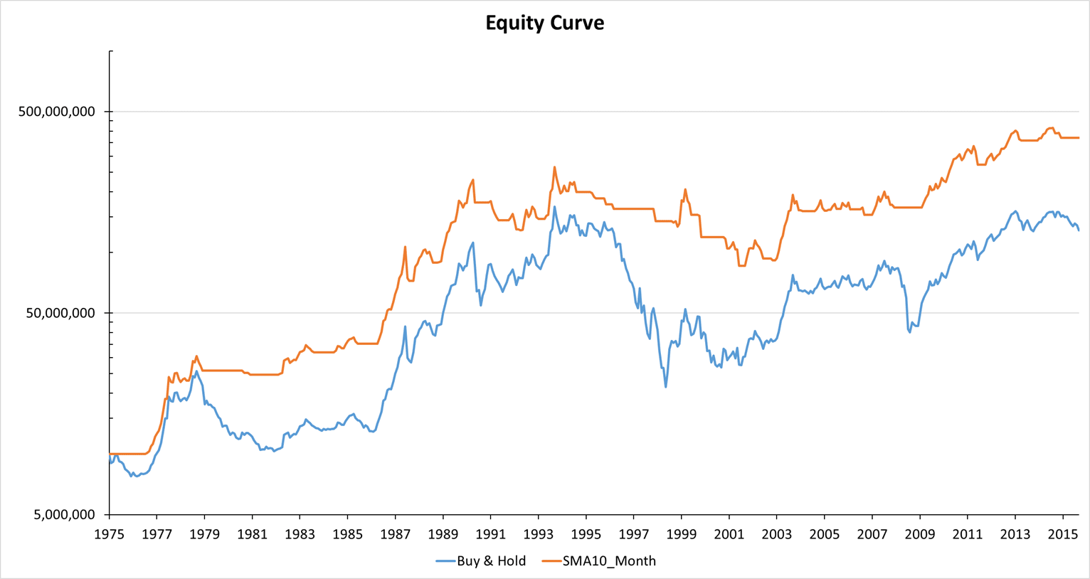 ในส่วนแรกนี้เราจะทดสอบระบบเส้นค่าเฉลี่ย 10 เดือน (Simple Moving Average 10 Months – SMA10_Month) กับ SET Index โดยใช้ข้อมูลตั้งแต่วันแรกที่เปิดตลาดมารวมกว่า 40 ปีเลยทีเดียว เพื่อดูประสิทธิภาพของระบบในการจับแนวโน้ม หรือจังหวะของตลาดที่เกิดขึ้น โดยมีรายละเอียดดังนี้ครับ