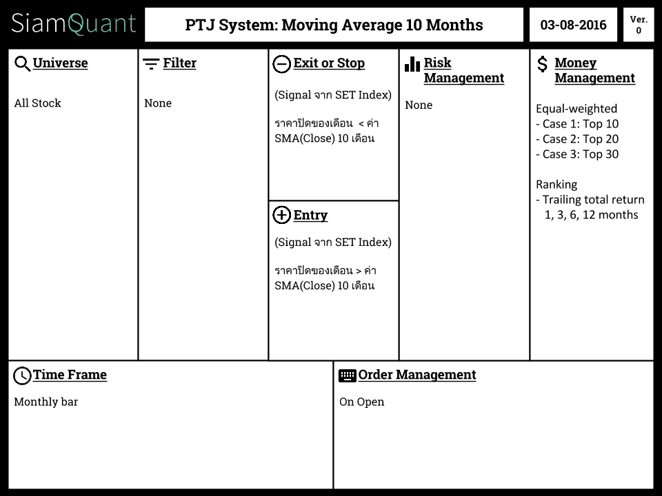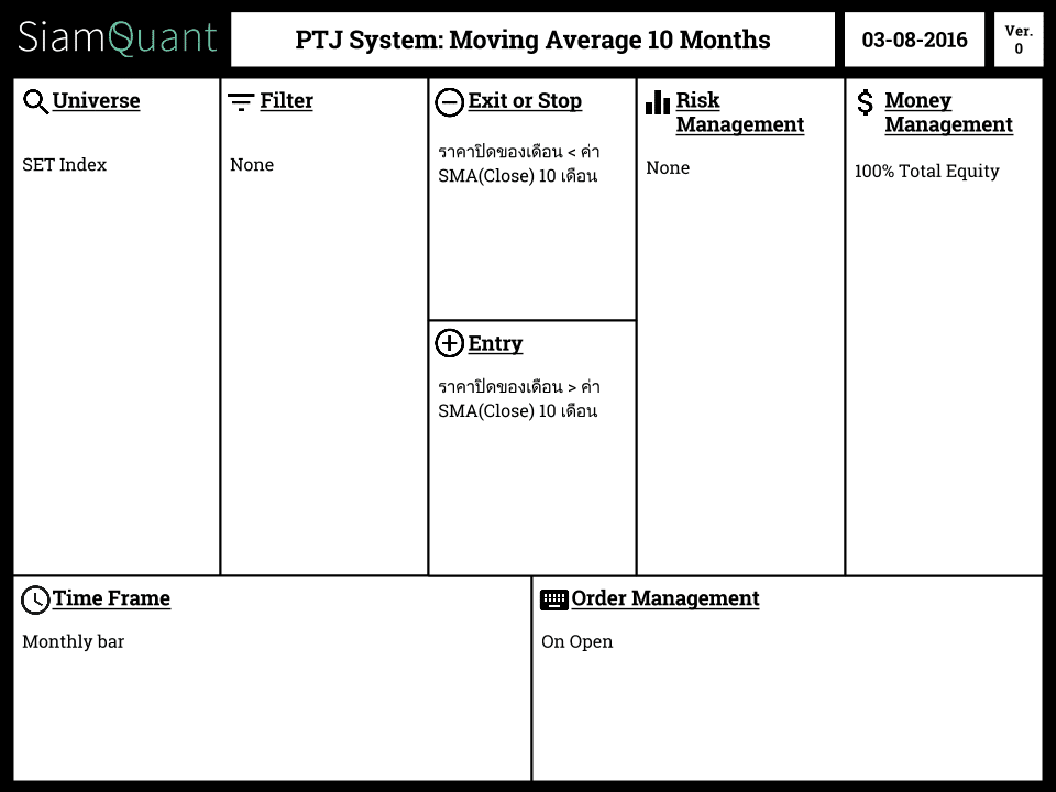 • จุดขาย (Exit) : เมื่อราคาปิดของ SET Index นั้นตัดเส้นค่าเฉลี่ย Moving Average 10 เดือนลงจากด้านบน (Cross Down)