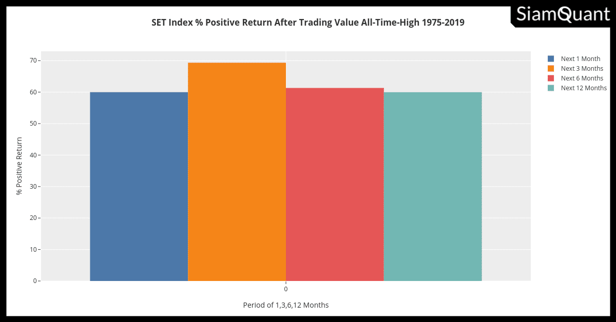 คำตอบนั้นสามารถอธิบายได้อย่างรวดเร็วจากกราฟ Bar Chart ที่ได้แสดงให้เห็นถึงโอกาสของผลตอบแทนที่เป็นบวกในอนาคต ตามช่วงระยะเวลา 1,3,6,12 เดือนหลังจากเกิดเหตุการณ์ขึ้น (SET Index % Positive Return After All-Time-High Trading Value) โดยที่เราจะเห็นได้อย่างชัดเจนว่า มีโอกาสที่สูงมากๆถึงราวๆ 60% เลยทีเดียว ที่ SET Index จะให้ผลตอบแทนที่เป็นบวกหลังจากนี้