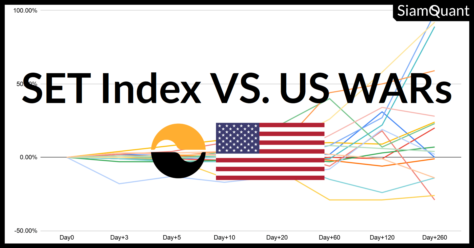 Home»งานวิจัยและบทความทั้งหมด»บทความพิเศษ»สถิติตลาดหุ้นไทยกับสงครามของอเมริกา»SET Index vs Wars Blog FB Cover – SiamQuant