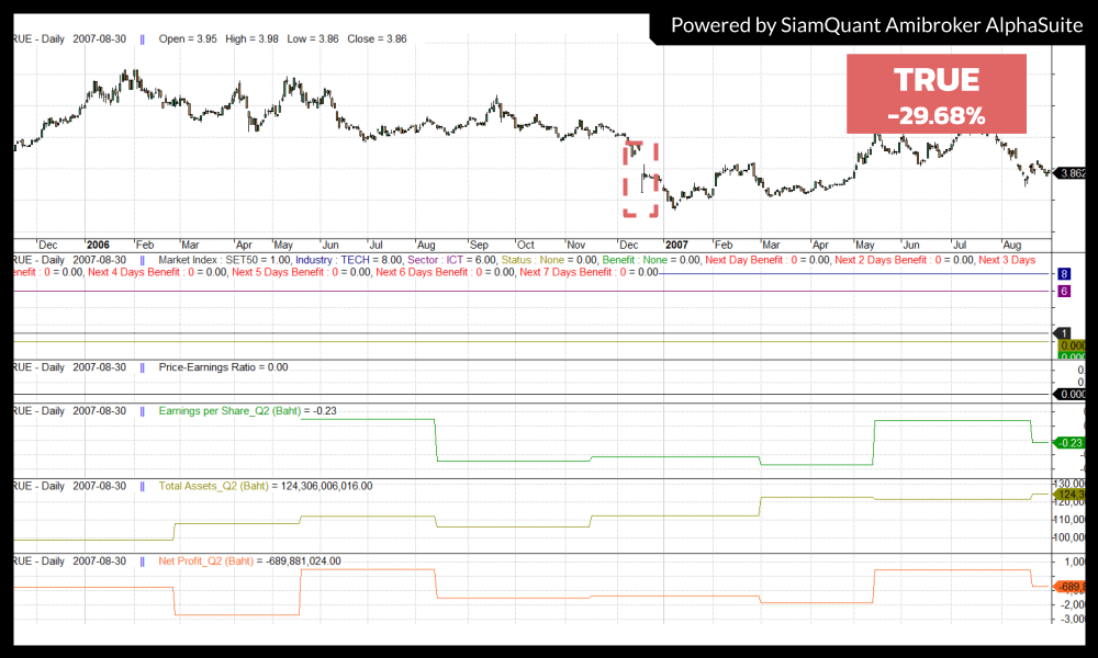 อันดับที่ 5 : บริษัท ทรู คอร์ปอเรชั่น จำกัด (มหาชน) หรือ TRUE โดยมีอัตราการเปลี่ยนแปลง -29.68% ณ วันที่ 19/12/2006