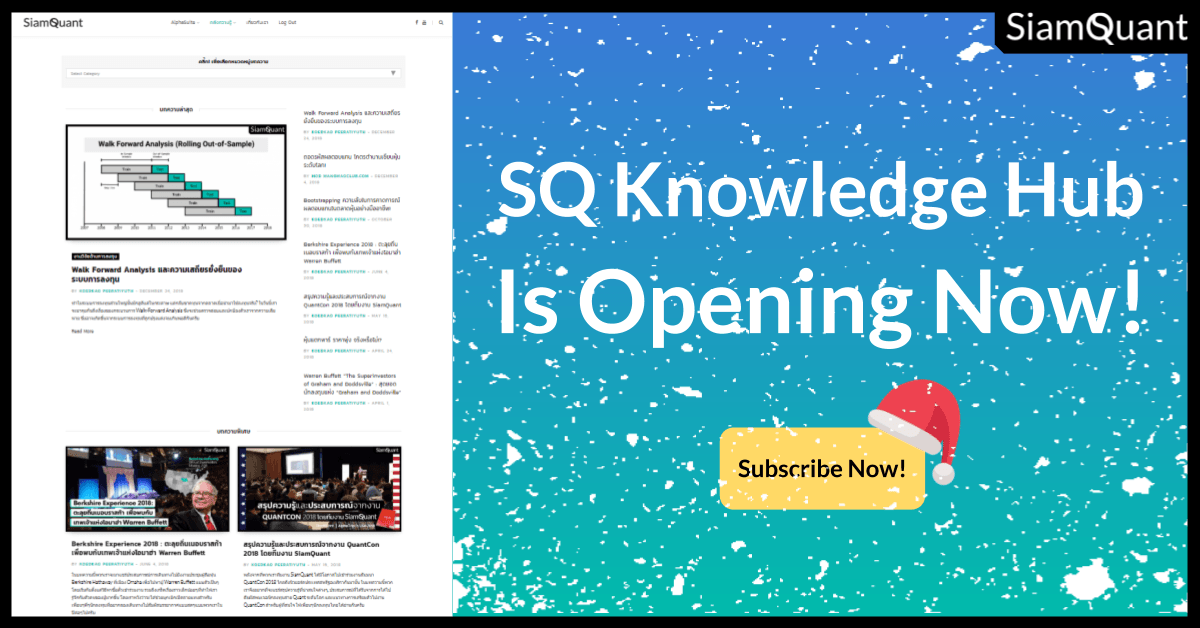 เทศกาลคริสต์มาสในปีนี้ พวกเราทีมงาน SiamQuant ขอมอบโครงการ “SiamQuant Knowledge Hub : คลังความรู้ด้านการลงทุนอย่างเป็นระบบ” ให้เป็นของขวัญกับนักลงทุนไทยทุกคน โดยต่อจากนี้เราจะเริ่มต้น Share ความรู้ความเข้าใจ ที่ได้มาจากการวิจัยเชิงลึกและการลงทุนจริงๆของพวกเรา พร้อมอัพเดทข่าวสารกองทุนเชิง Quant Fund ให้ทุกคนได้เข้ามาศึกษากันอย่างต่อเนื่องโดยไม่มีค่าใช้จ่ายใดๆทั้งสิ้น