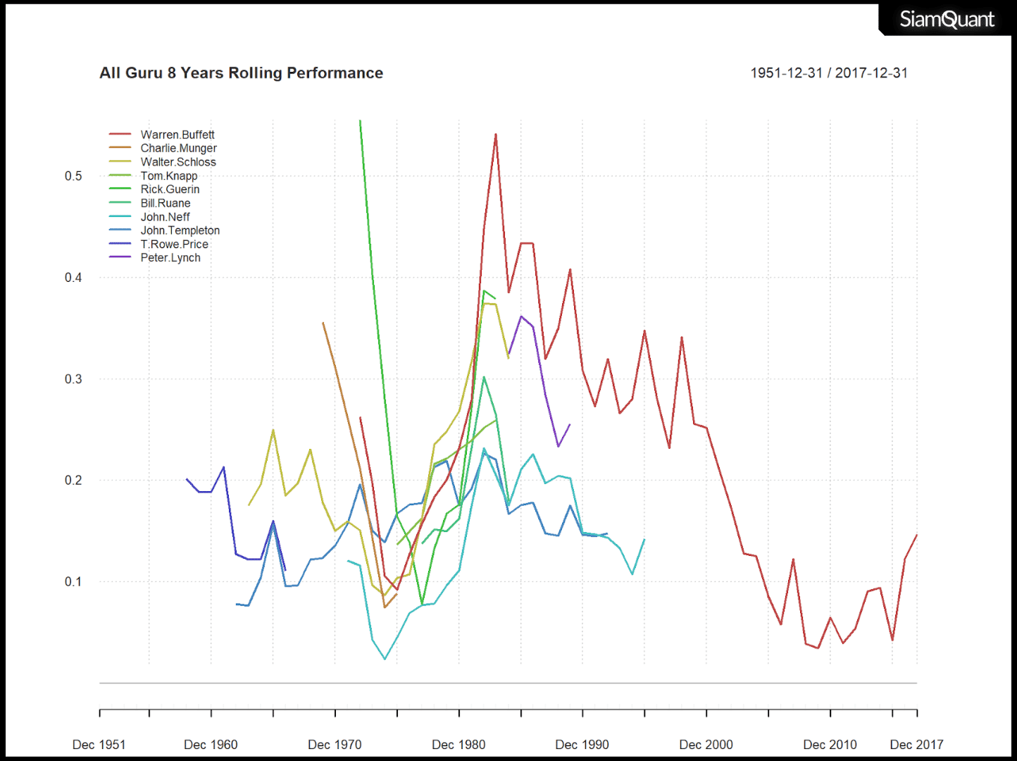 Home»งานวิจัยและบทความทั้งหมด»องค์ความรู้จากการลงทุนอย่างเป็นระบบ»ถอดรหัสผลตอบแทน โคตรตำนานเซียนหุ้นระดับโลก!»All Guru 8 Years Rolling Performance – SiamQuant
